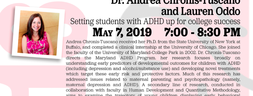Dr. Andrea Chronis-Tuscano received her Ph.D. from the State University of New York at Buffalo, and completed a clinical internship at the University of Chicago. She joined the faculty of the University of Maryland-College Park in 2002. Dr. Chronis-Tuscano directs the Maryland ADHD Program. her research focuses broadly on understanding early predictors of developmental outcomes for children with ADHD (including depression and alcohol/substance use) and developing novel treatments which target these early risk and protective factors. Much of this research has addressed issues related to maternal parenting and psychopathology (namely, maternal depression and ADHD). A secondary line of research, conducted in collaboration with faculty in Human Development and Quantitative Methodology, aims to examine the trajectory of young children displaying early behavioral inhibition, including the development of psychopathology, and to intervene by targeting key moderators of outcome (e.g., parenting and social relationships).